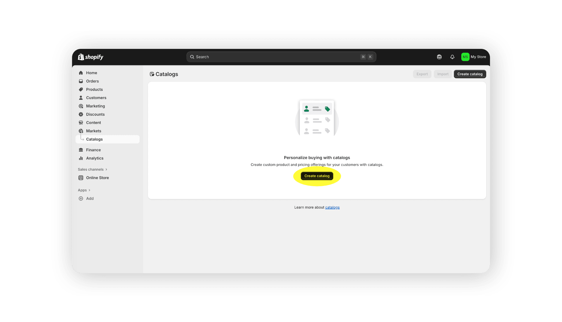 Zunächst erfolgt der Zugriff über das Shopify-Admin-Panel. Nach dem Einloggen führt der Weg über den Menüpunkt “Märkte“ direkt zu „Kataloge“. Dort lässt sich per Klick auf „Katalog erstellen“ ein neuer Produktkatalog anlegen. Shopify öffnet anschließend eine neue Seite, in der alle weiteren Einstellungen vorgenommen werden.