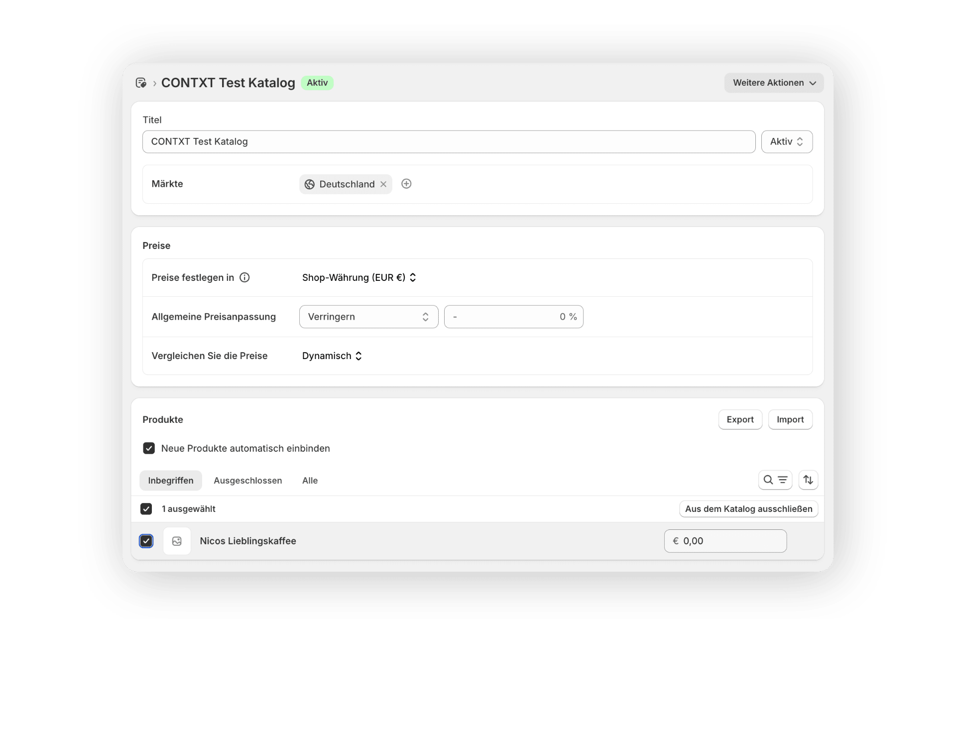 Nach dem Abschluss aller Einstellungen klickt ihr am oberen Bildschirmrand auf “Speichern”. Durch das Setzen des Status auf „Aktiv“ steht er für den Einsatz bereit. Ansonsten könnt ihr den Status neben dem Titel auf “Entwurf” stellen. Optional kann der Katalog gezielt bestimmten Firmen oder Kundengruppen zugewiesen werden, was vor allem im Geschäftskundensegment hilfreich ist.