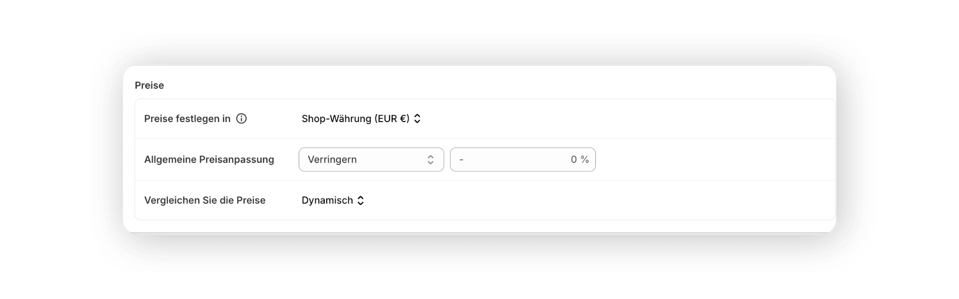 Unter dem Punkt “Preise” lässt sich optional eine Währung festlegen. Das ist vor allem dann sinnvoll, wenn der Shop international tätig ist. Shopify ermöglicht es natürlich auch, die Preisgestaltung flexibel abzustimmen. Unter dem Punkte “Allgemeine Preisanpassungen lassen sich prozentuale Auf- oder Abschläge für alle Produkte im Katalog festlegen – eine praktische Lösung etwa für Rabattaktionen oder Großhandelskonditionen.