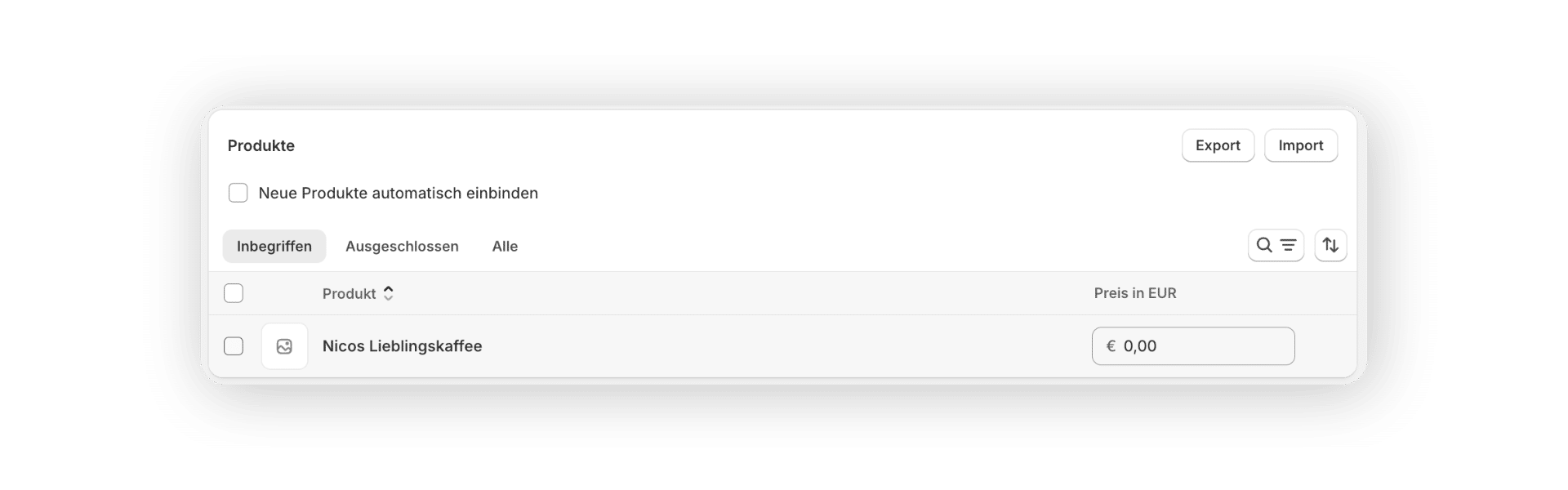 Im nächsten Schritt könnt ihr entscheiden, welche Produkte in den Katalog aufgenommen werden sollen. Shopify bietet dir dafür zwei Varianten: Mit „Alle (Produkte)“ werden sämtliche Artikel des Shops integriert – ideal, wenn ein vollständiger Überblick gewünscht ist. Alternativ könnt ihr unter „Inbegriffen“ aber auch gezielt auswählen, welche Artikel erscheinen sollen. Diese Variante eignet sich besonders für saisonale Angebote oder B2B-Kataloge mit eingeschränktem Sortiment.