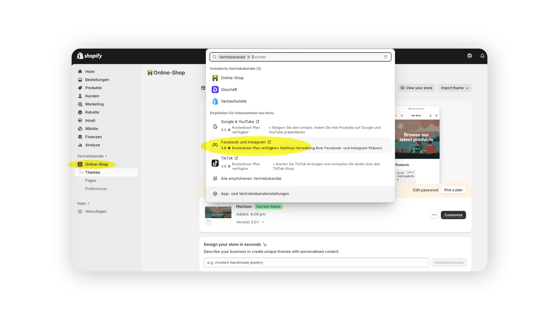 Zunächst erfolgt die Installation: Im Shopify-Adminbereich unter „Vertriebskanäle“ wird „Facebook & Instagram“ ausgewählt.