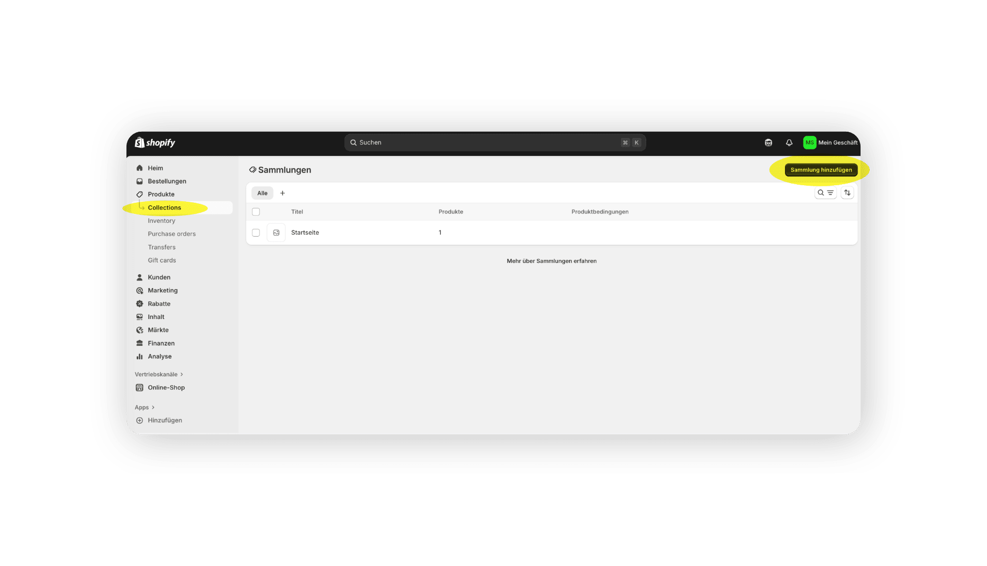 Im Adminbereich führt der Weg über „Produkte“ hin zu „Kollektionen“. Dort lässt sich mit Klick auf “Sammlung hinzufügen” eine neue Auswahl anlegen.