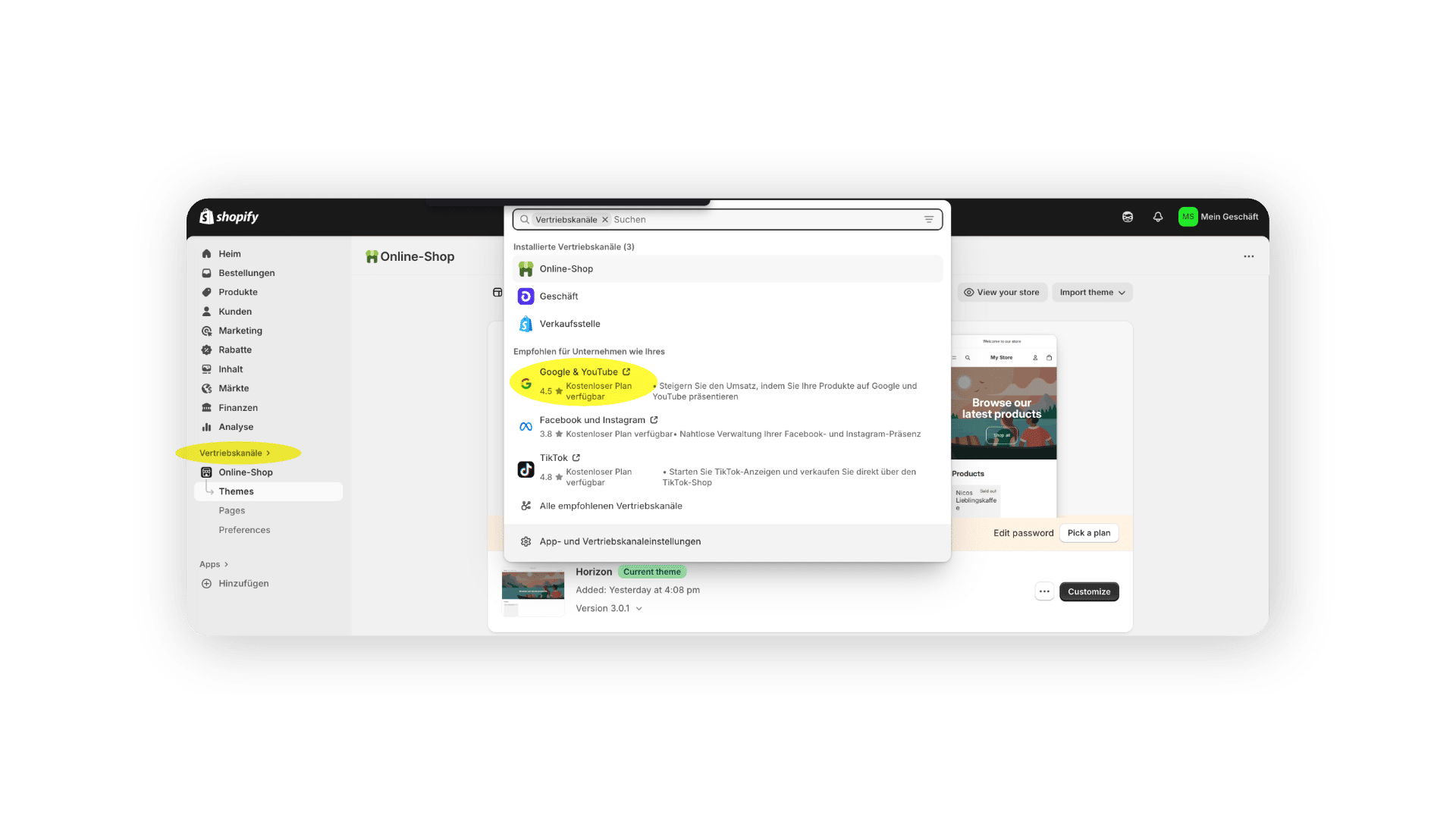 Für die Integration von Google Ads ist die Shopify-App „Google & YouTube“ der erste Anlaufpunkt. Sie synchronisiert den Produktfeed automatisch mit dem Google Merchant Center. Werden Artikel aus besonderen Branchen angeboten, beispielsweise Nahrungsergänzungsmittel oder Medizinprodukte, kann eine manuelle Freischaltung erforderlich sein. Nach der Verknüpfung des Google-Kontos lassen sich Zielmärkte, Sprachen und Anzeigenformate festlegen. Hierfür navigiert ihr wieder zum Punkt “Vertriebskanäle”, wählt “Google & YouTube” aus und installiert die entsprechende App.