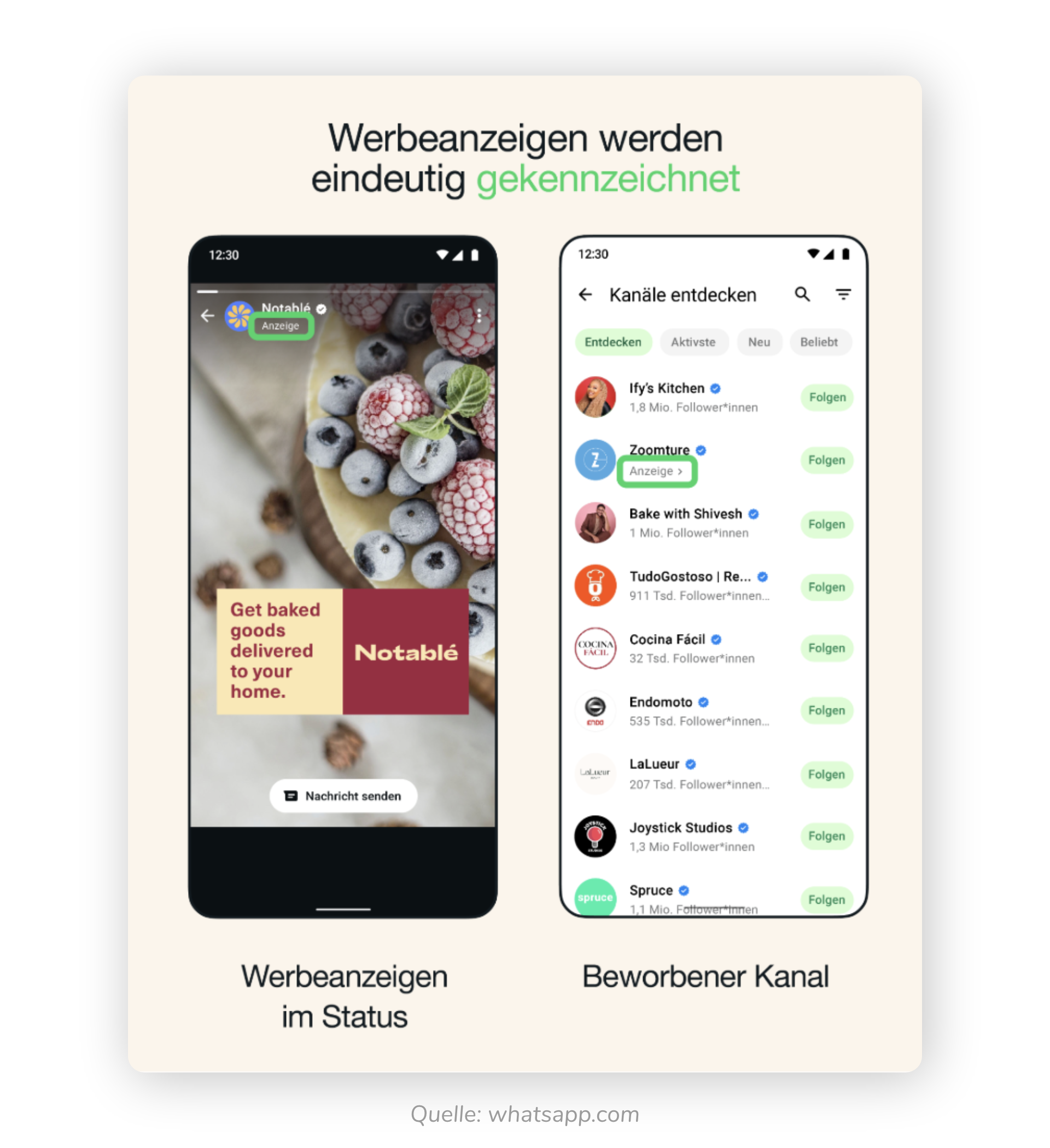 Diese von Meta bestätigte Entwicklung markiert das Ende der Werbefreiheit im “Aktuelles”-Tab des Messengers. Neu im Jahr 2026 ist die nahtlose Verknüpfung: NutzerInnen können nun nicht mehr nur auf externe Seiten geleitet werden, sondern direkt aus einer Status-Ad heraus einen verifizierten WhatsApp-Kanal abonnieren oder eine KI-gestützte Verkaufsberatung im Chat starten. Die Status Ads sind visuell direkt mit den klassischen Instagram Story-Ads vergleichbar, was das Cross-Platform-Posting enorm erleichtert.